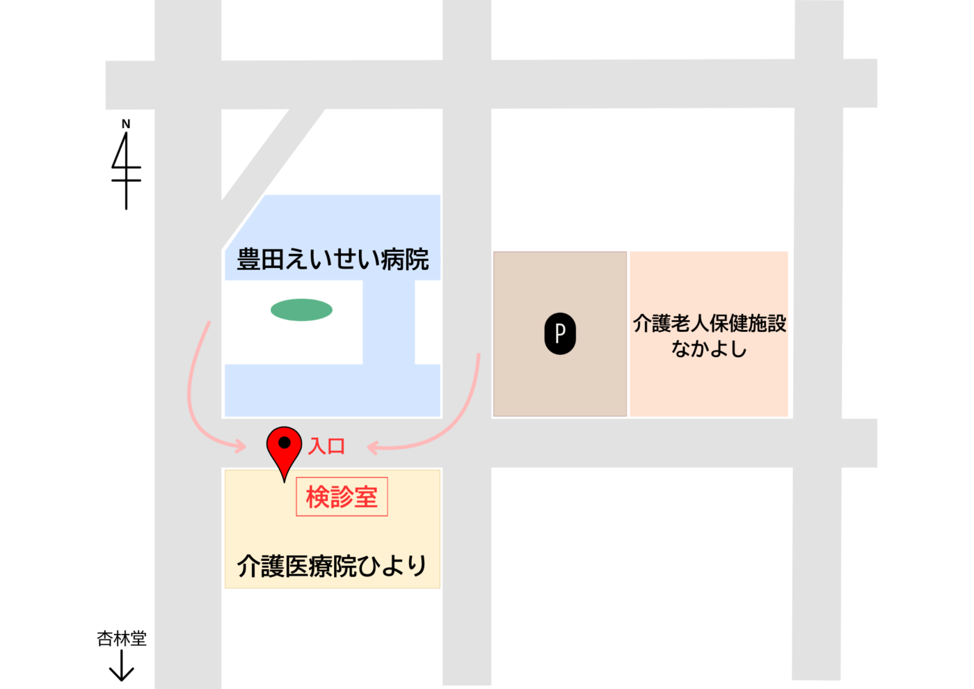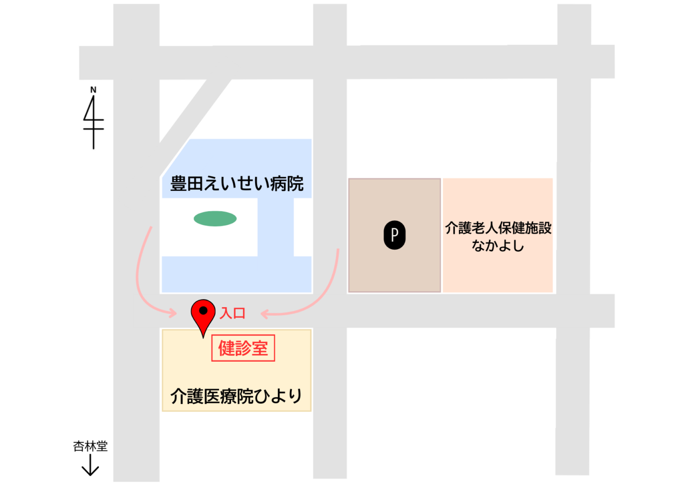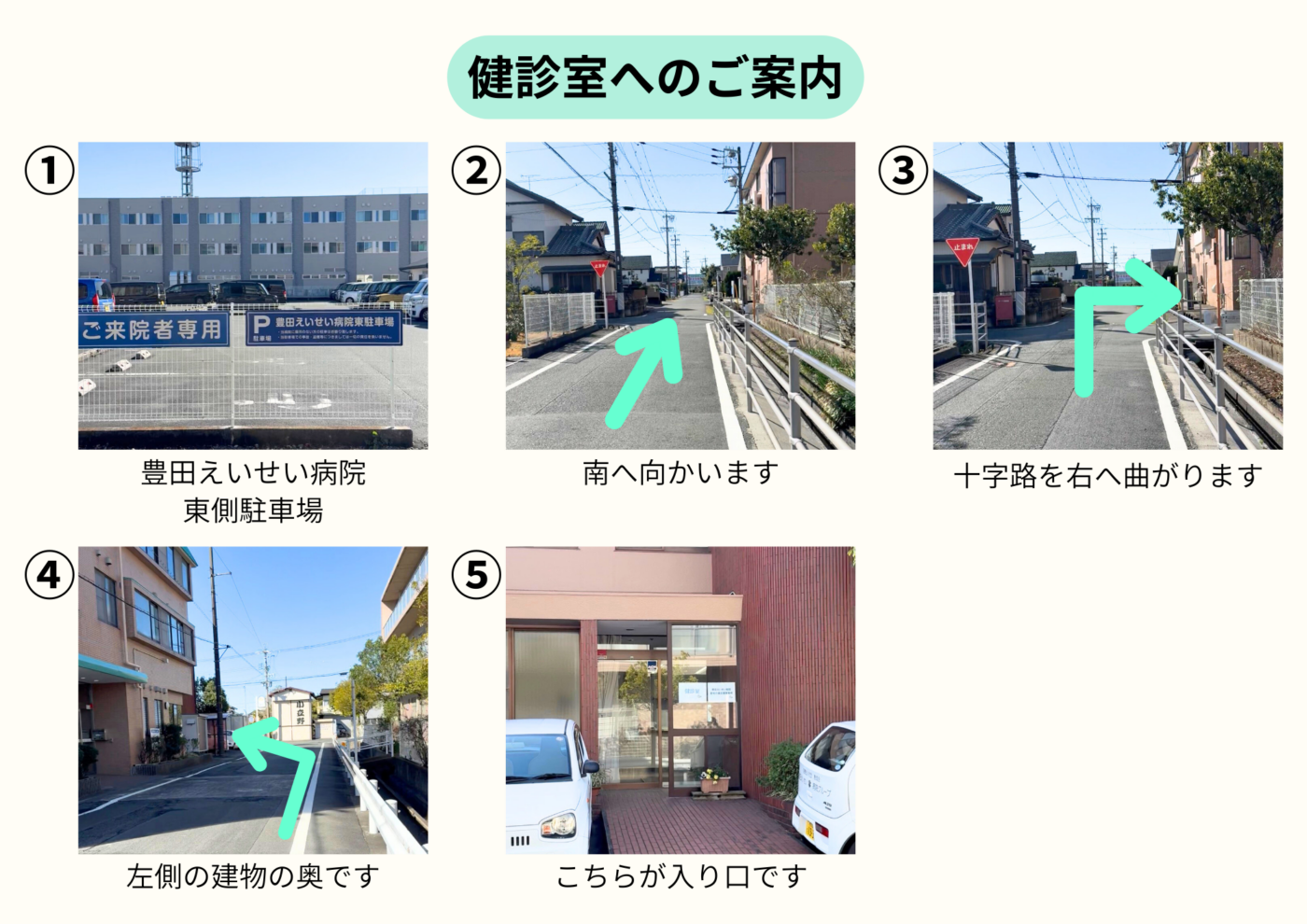 健診室は、豊田えいせい病院の道を挟んで南側の建物にあります。